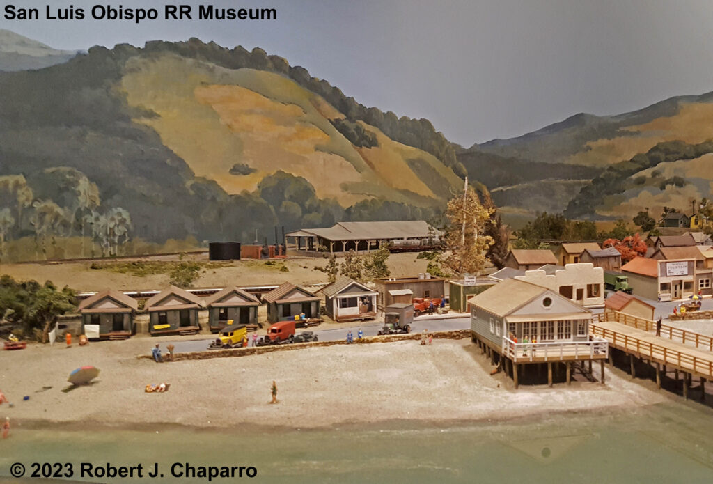 Currently the Pacific Coast Railway HOn3 model railroad includes Avila Beach and the Port Harford Pier areas. The major elements include Harford Pier (nearly 16 feet in length), a four-foot high painted backdrop of the harbor area and the town of Avila Beach in the early 1930s, including the award-winning wood truss bridge over San Luis Obispo Creek as featured on the cover of the September 2012 issue of Railroad Model Craftsman.